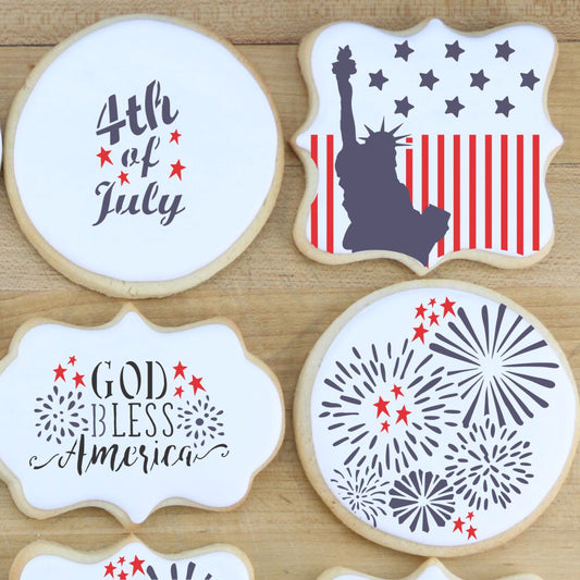 Celebrate the 4th of July with Holiday Stenciled Cookies and Cakes! Serve dazzling desserts at fourth of July picnics by decorating cookies and cakes with our Fireworks Background Cookie Stencil. Frost the perfect twinkling background using our Stars Background Cookie Stencil. Stencil a patriotic flare in frosting with our Patriotic Accent Cookie Stencil and celebrate with articulately scrumptious desserts using our Patriotic Words Cookie Stencil. Let your cookies and cakes shine this 4th of July and stencil celebratory fireworks or the Statue of Liberty onto cookies and cakes with our Fireworks Cookie Stencil Set.