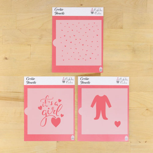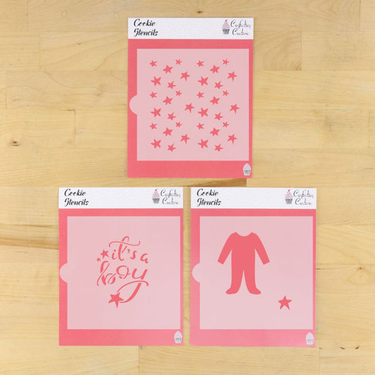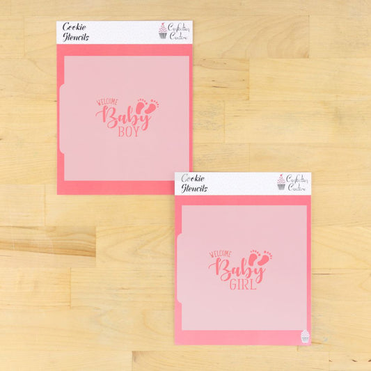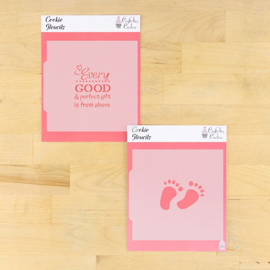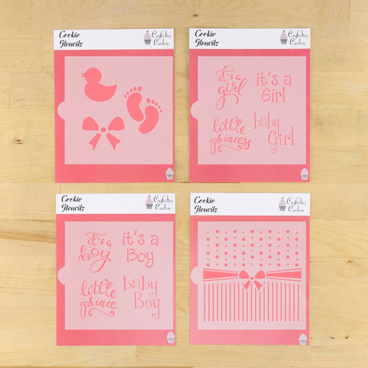 Decorate delicious cookies and cakes with Baby Shower themed cookie stencils! Find your perfect Baby Shower decorating stencil from our beautiful designs by Julia Usher and Confection Couture! Celebrate sweet moments with your friends and family with baby shower cookies stencils. Frost edible birth announcements with our It's A Girl and It's A Boy cookie stencils, or commemorate your family addition in royal icing with our Family of Birds cookie stencils or Bear Family cookie stencil! Choose an elegant, detailed cookie aesthetic with our Baby 2 Prettier Plaques cookie stencil by Julia Usher. Our Baby Round cookie stencil set helps you decorate adorable baby footprints on baby shower desserts.