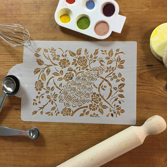 Floral Tree Peacock Cake Stencil Side by Designer Stencils