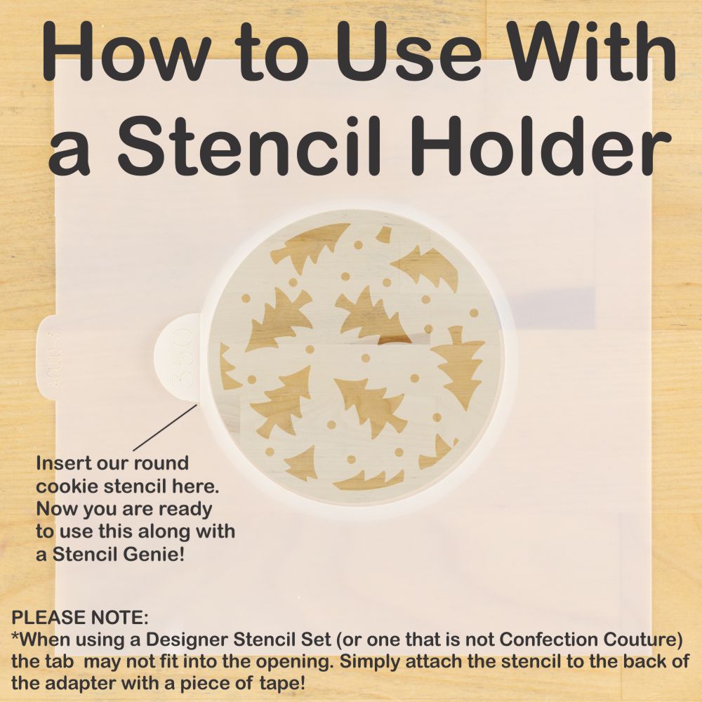 ⚠️ PLEASE NOTE IF YOU ARE USING IN CONJUNCTION WITH A STENCIL HOLDER LIKE THE STENCIL GENIE: Use these round sets in conjunction with our Stencil Adapters for Round Cookie Stencils If the stencil tabs don't fit through the opening, you can use tape to affix them to the back of the adapter and it will work like a charm!