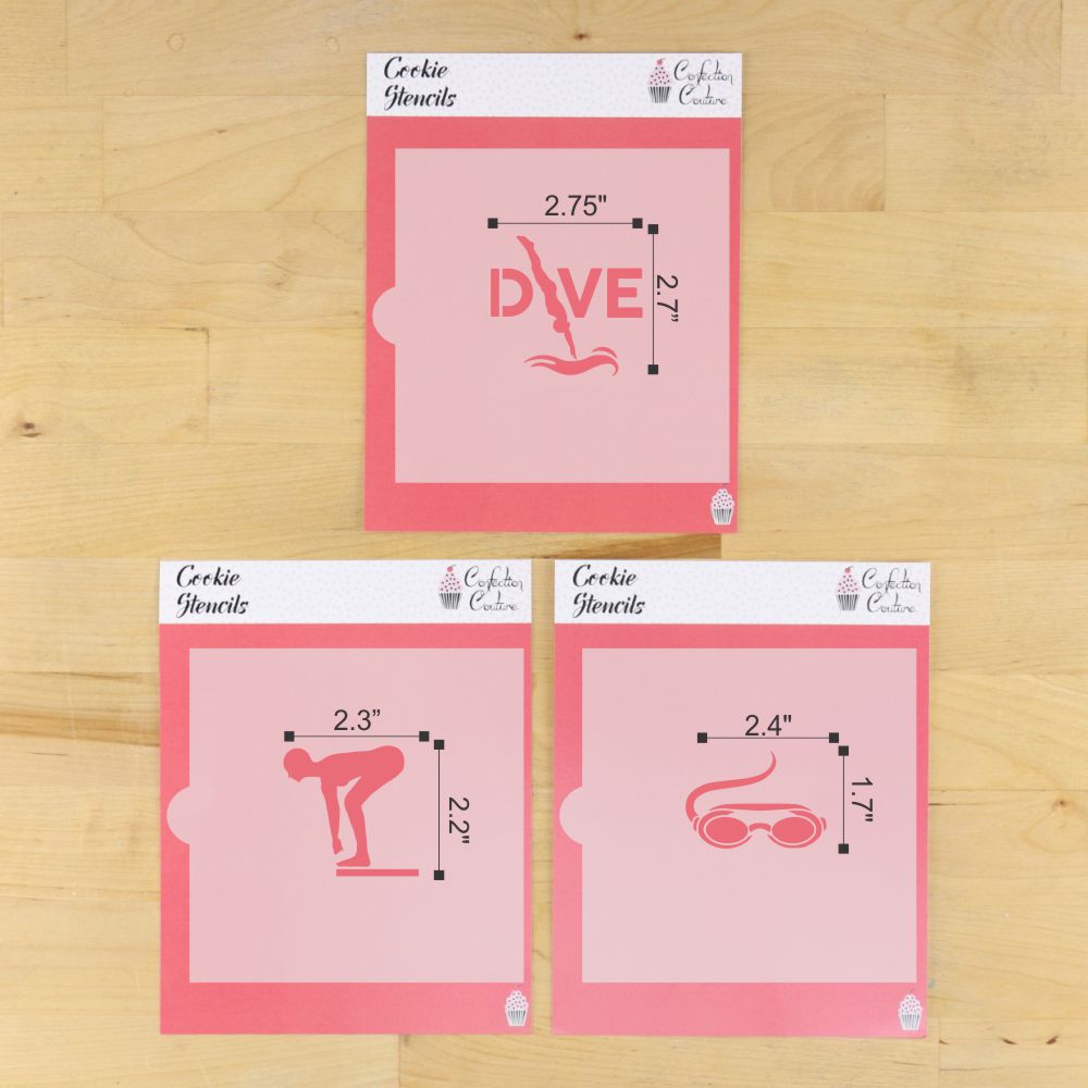 Dive into decorating with this three-piece cookie stencil set perfect for swim enthusiasts! Features a dynamic male diver, swim goggles, and playful diving-themed messages ideal for customizing cookies with royal icing or airbrushing techniques. Whether you're celebrating swim meets, swimming competitions, or Olympic events, these cookie decorating stencils add a splash of fun to your baking. Each stencil delivers crisp, professional designs that transform plain cookies into impressive treats. Perfect for swimmers, coaches, and baking enthusiasts looking to create themed desserts that make waves at any celebration.