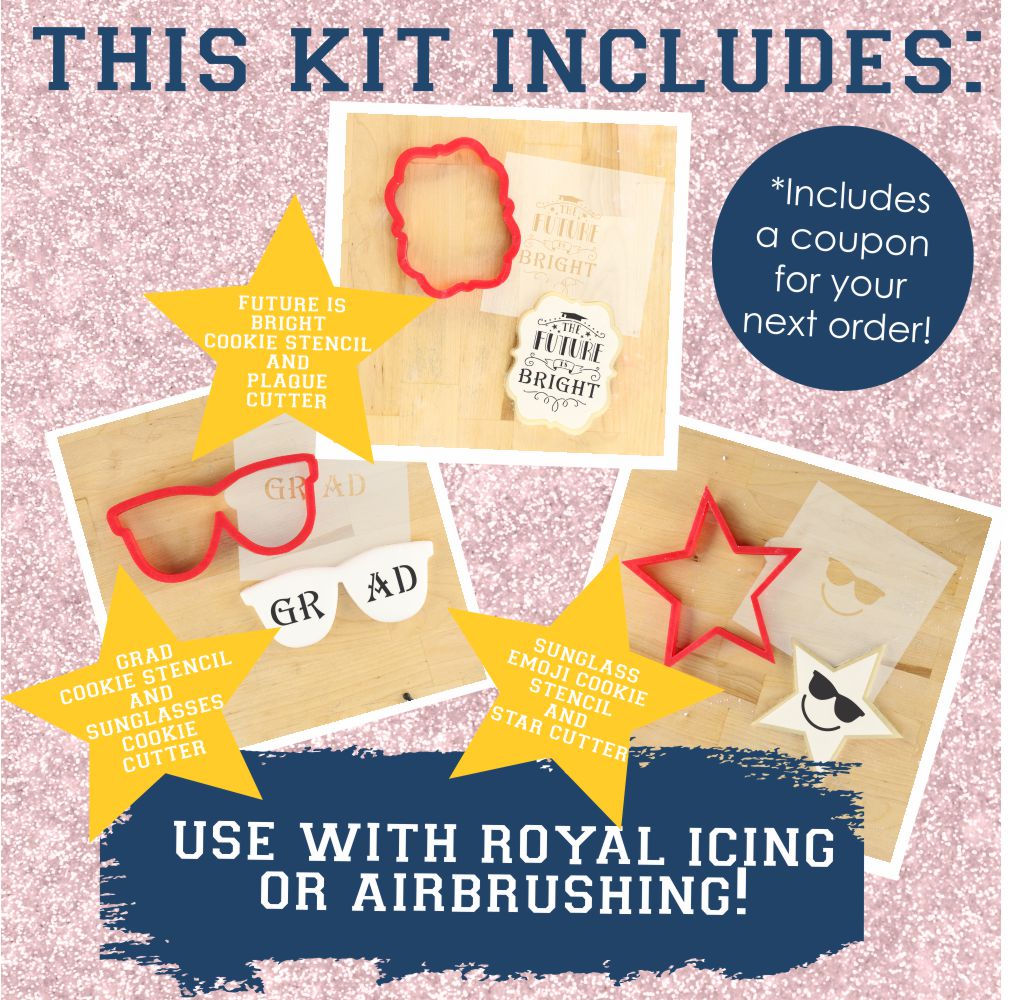 Decorate cookies for your 2025 Graduate with our Future is Bright Graduation Cookie Decorating Kit 😎! Featuring three graduation cookie stencils and three matching cookie cutters, this kit is perfect for seasoned decorators or beginners! We give you the tools, then you choose whether to use it with airbrushing or royal icing. Plus, receive a 25% off coupon for your next purchase! Get creative and make amazing cookies for any graduation party!