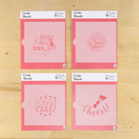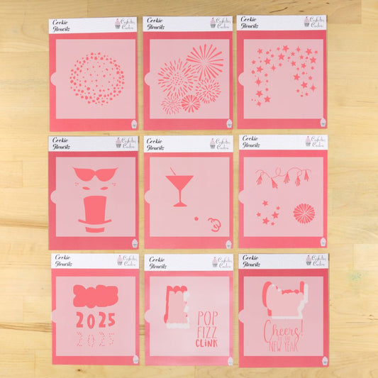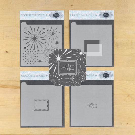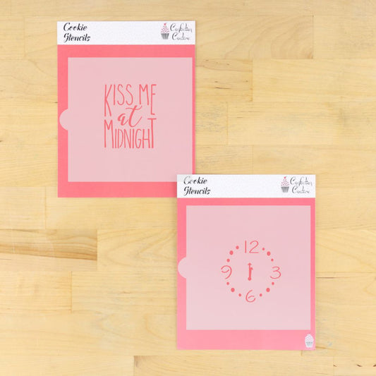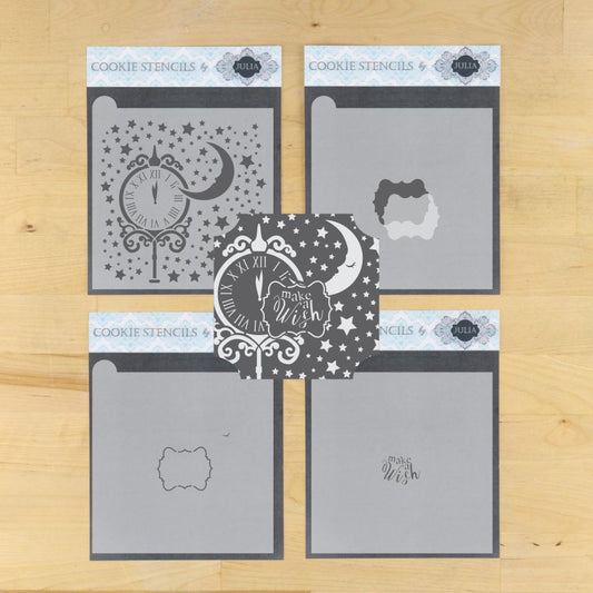 Ring in the New Year with our New Years Cookie Stencils. Ideas include decorating New Years Favors with our Pop the Bubbly Prettier Plaque stencil. Decorating cookies with our Ring in the New Year stencil set. Using our cake stencils to ice or powder New Years Clocks on cakes or desserts. Make Fun Macarons and Iced Oreo Round Cookies with our New Year's Round cookie stencils.