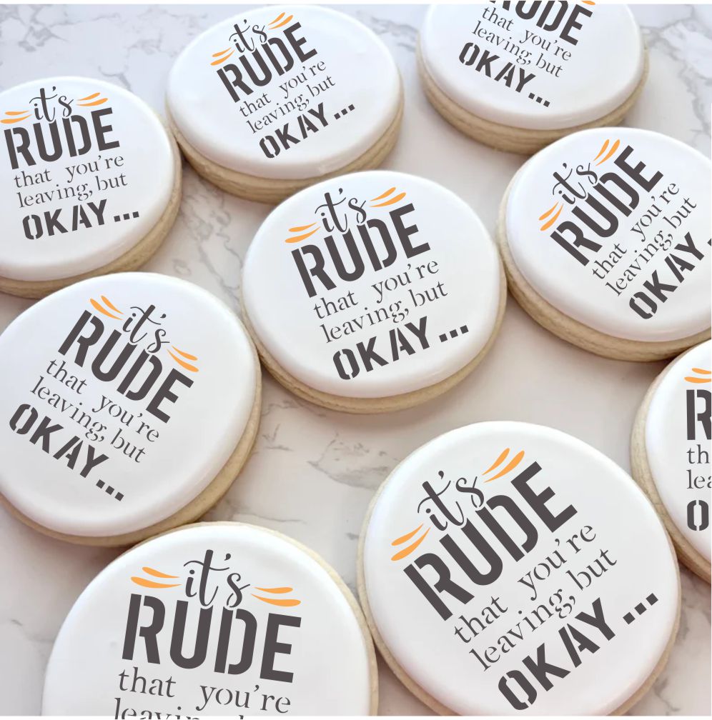 Say goodbye to your friends, neighbors, or coworkers with this hilarious cookie stencil! Featuring a funny message, giving them luck, and expressing that you'll miss them, this stencil is a sweet way to show you care. Plus, it's easy enough for any skill level, whether you choose to apply it with airbrush or royal icing! We won't be too (cookie)rude and make you stay.